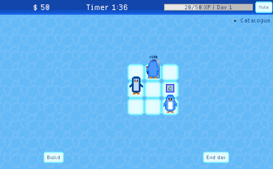The core gameplay loop revolves around placing arcade-style machines for penguin customers to enjoy. Each machine generates money after being used, which the player must collect manually. However, machines occasionally break down and require repairs.