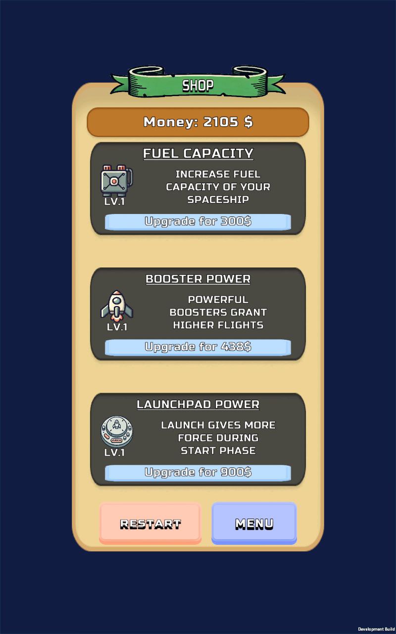— Fuel tank: As mentioned earlier, during the flight, the spaceship consumes fuel, and the higher the spaceship goes, the more fuel it consumes. At some point, the consumption becomes so high that collecting fuel objects won't be enough. To avoid this, the player can upgrade the fuel tank, which increases the amount of fuel available.