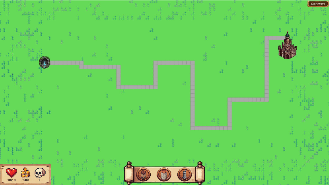 Each game session in TowerDefensio is unique. First, the game randomly generates the path for enemies from the portal to the castle by selecting five random points across the map. This ensures that no two sessions have the same layout.